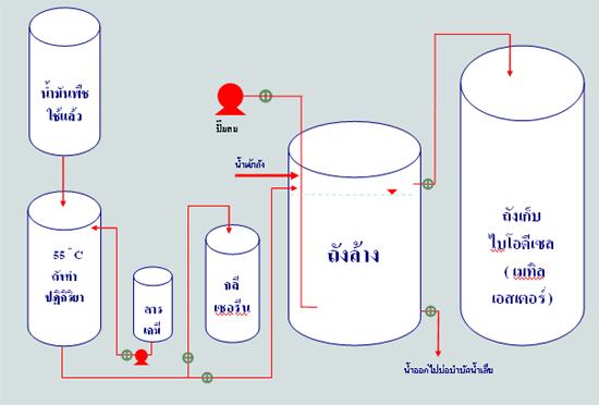 55 oC เวลาประมาณ 30 นาที จะได้กรีเซอรีนแยกตัวจากน้ำมัน หลังจากนั้นทำการล้างจนเสร็จกระบวนการ