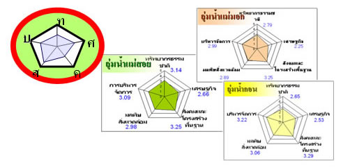 ภาพที่ 2 ตัวอย่างผลลัพธ์ของการศึกษาทุนการพัฒนาชุมชนท้องถิ่นทั้ง 5 ด้านของลุ่มน้ำแม่สอย ลุ่มน้ำแม่สอย และลุ่มน้ำกอน