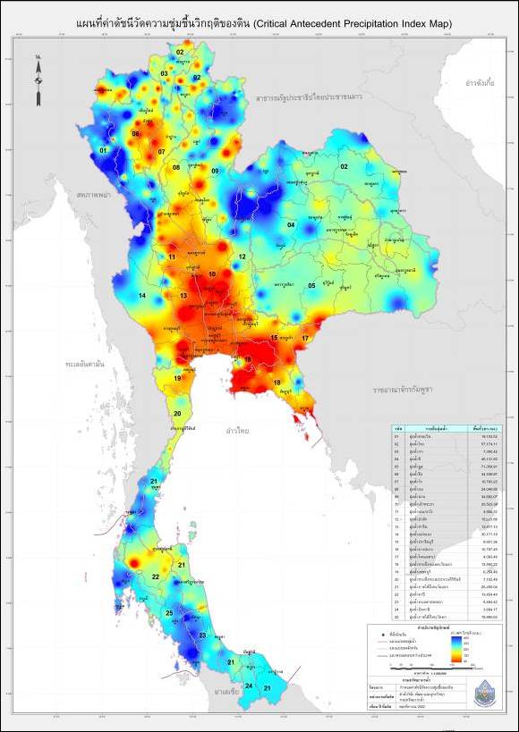 (8) ในภาพรวมของประเทศไทยค่าดัชนีวัดความชุ่มชื้นวิกฤติของดินสูงสุดเท่ากับ 397.07 มิลลิเมตรบริเวณลุ่มน้ำสาละวิน ซึ่งหมายความว่า ดินบริเวณนั้นสามารถรองรับน้ำฝนได้สูงสุด ประมาณ 397.07 มิลลิเมตรจึงจะมีความเสี่ยงภัยน้ำท่วม-ดินถล่มทั้งนี้ขึ้นอยู่กับความหนักเบาของฝนด้วย และมีค่าดัชนีวัดความชุ่มชื้นวิกฤติของดินต่ำสุดเท่ากับ 40.62 มิลลิเมตร บริเวณลุ่มน้ำเพชรบุรีซึ่งหมายความว่าดินบริเวณนั้นสามารถรองรับน้ำฝนได้สูงสุด ประมาณ 40.62 มิลลิเมตรจึงเกิดน้ำท่วม-ดินถล่ม ซึ่งหากเปรียบเทียบกับความหนักเบาของฝนแสดงว่าพื้นที่ดังกล่าวมีความเสี่ยงเกิดน้ำท่วม-ดินถล่มสูง ในการใช้ค่า API วิกฤติในการเตือนภัยน้ำท่วมฉับพลันนั้นจะใช้เปรียบเทียบกับค่า API แบบใกล้เคียงเวลาจริงถ้ามีค่าใกล้เคียงกันหรือเกือบถึงค่าวิกฤติแสดงว่าบริเวณนั้นมีความเสี่ยงจะเกิดน้ำท่วมฉับพลันต้องมีการเฝ้าระวัง ติดตามสถานการณ์ และอพยพตามลำดับ