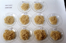 มีความเหนียวนุ่ม แรงดึงให้ขาดน้อยกว่า และมีคุณภาพทางด้านเนื้อสัมผัสแตกต่างจากบะหมี่แป้งสาลีล้วนอย่างมีนัยสำคัญทางสถิติ